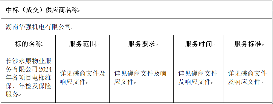 长沙永康物业服务有限公司2024年各项目电梯维保、年检及保险服务第1次中标(成交)结果公告